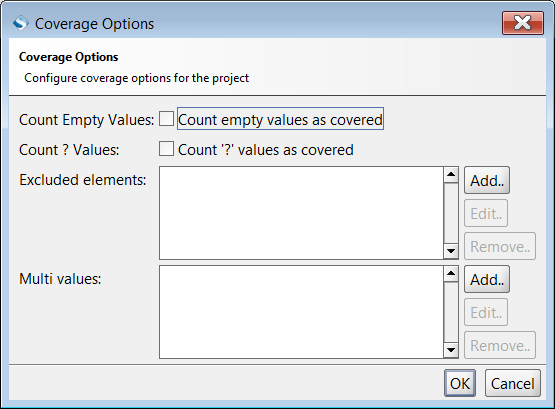 Use this to create a comma-separated list of values which will count coverage for the specified values. Format elementname@namespace. An example could be if you have a weekday element you could enter day@http://example.com=mon,tue,wed,thu,fri,sat,sun and coverage will be calculated for the complete set of values.