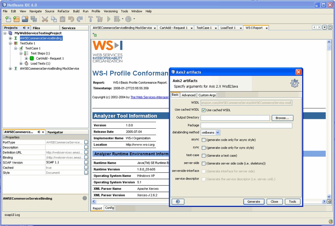 (Axis2 Wizard with WS-I Basic Profile Report in background)